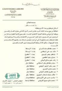 وتابع السيد الصدر، “العراق بذمتكم والدين بذمتكم والمذهب بذمتكم”، قبل أن يختتم منشوره بوسم: “نحن علويون وهم فاسدون”.