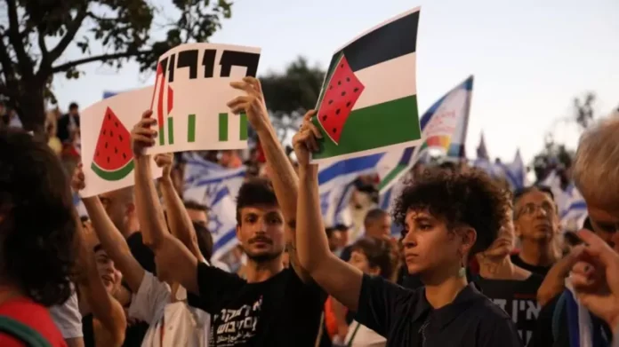 وفي احتجاج بالقدس في يوليو/تموز، رفع المتظاهرون الإسرائيليون لافتات بألوان العلم الفلسطيني وصور شرائح البطيخ أو كلمة “حرية” بالألوان ذاتها.