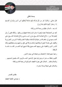 وأضاف: “راجياً منهم إتخاذ الاحتياط ومراجعتنا في مهام الامور، اللهم واحفظ سامراء وحوزتها بحق الإمامين العسكريين الشفيعين لمحبيهم والسلام ختام .. السلام على حوزة النجف المركزية ورحمة اللّٰه وبركاته والسلام على شيعة وسنة سامراء”.
