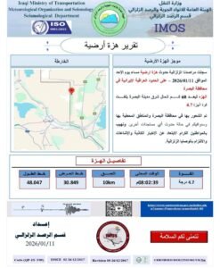 كشفت الهيئة العامة للأنواء الجوية والرصد الزلزالي، اليوم الأحد، عن تسجيل هزة أرضية على الحدود العراقية–الإيرانية ضمن محافظة البصرة، وذلك في تمام الساعة 08:02:39 مساءً من يوم 11 كانون الثاني 2026.