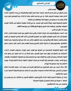 وحذّر العسكري في بيانه من تسرب بعض العراقيين من المناطق الغربية إلى سوريا بدعوى “الفزعة” إلى ما وصفه بـ”نظام الجولاني الإجرامي”، داعيًا الأجهزة الأمنية إلى رصد هذه الظاهرة ومنع تفاقمها.