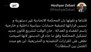 وقال زيباري في تدوينة عبر موقع “إكس” تابعها “إيشان”: “قلناها و نقولها بان المحكمة الاتحادية غير دستورية وتسيس قراراتها لتصفية حسابات سياسية داخلية و خارجية باسم القضاء و العدالة”.