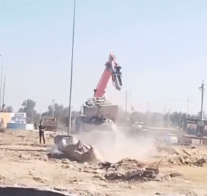 في المقطع، تظهر آلية حفر ضخمة وهي تُسقط التمثال أرضاً وسط غبار كثيف، بطريقة اعتبرها كثيرون “مهينة” لرمز فكري وثقافي شكّل أحد أعمدة اللغة العربية في القرن العشرين.