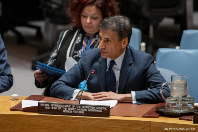 عقد مجلس الأمن الدولي، اليوم الثلاثاء، جلسة خاصة بشأن الوضع في العراق. فيما قدم ممثل الأمين العام للأمم المتحدة في العراق، محمد الحسان، إحاطة أمام المجلس.