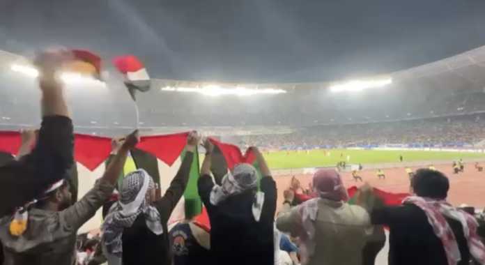 رفع عدد من مشجعي المنتخب العراقي، في ملعب جذع النخلة بمحافظة البصرة، الأعلام الفلسطينية وشعارات مؤيدة لفلسطين وغزة.