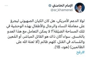 وذكر الخامنئي في تغريدة عبر اكس، تابعتها منصة “إيشان”، أنه “لو لا الدعم الأمريكي هل كان الكيان الصهيوني ليجرؤ على معاملة النساء والرجال والأطفال بهذه الوحشية في تلك المساحة الضيقة”.