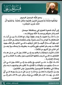 وجاء في كلمة الخزعلي التي وجهها إلى أبناء محافظة ميسان: