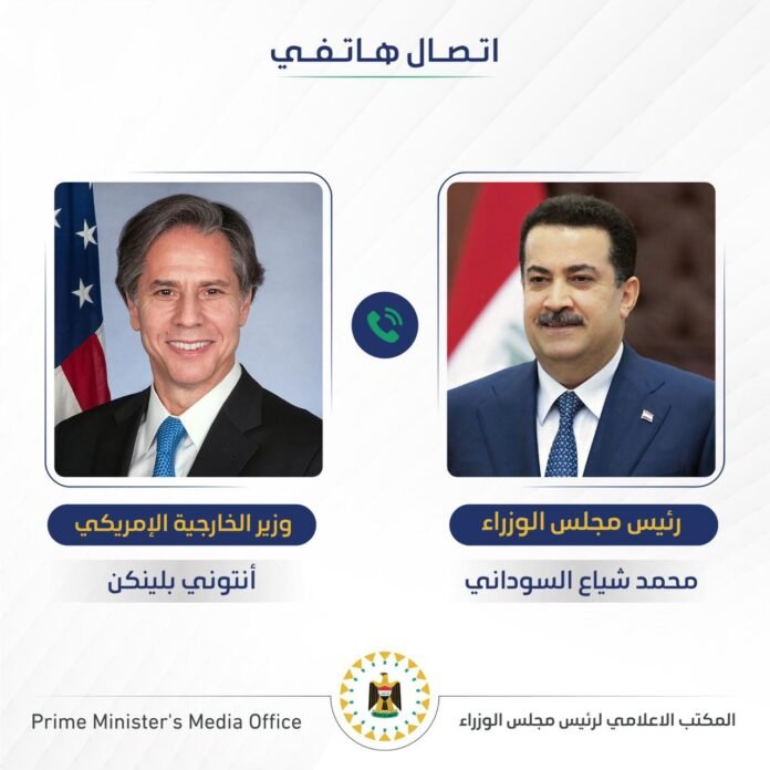 وقال المكتب الإعلامي لرئيس مجلس الوزراء في بيان تلقته “إيشان”، إن “رئيس مجلس الوزراء محمد شياع السوداني، تلقى اتصالاً هاتفياً من وزير الخارجية الأمريكي أنتوني بلينكن، جرى خلاله بحث آخر تطورات الأوضاع الإقليمية والدولية، ودور العراق في تدعيم السلم والاستقرار الدوليين، ومنع الأحداث الراهنة من المضيّ في مسار التصعيد”.