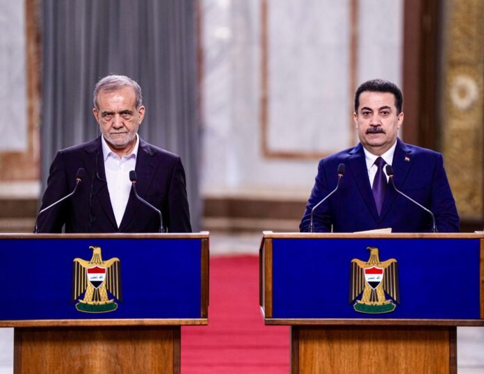 وقال السوداني خلال مؤتمر صحفي مشترك مع الرئيس الإيراني مسعود بزشكيان، إن “الشراكة مع طهران ركيزة أساسية لتطلعات الشعبين العراقي والإيراني”، مبينا “روابطنا تأريخية ومتينة وقديمة بين العراق وإيران”.