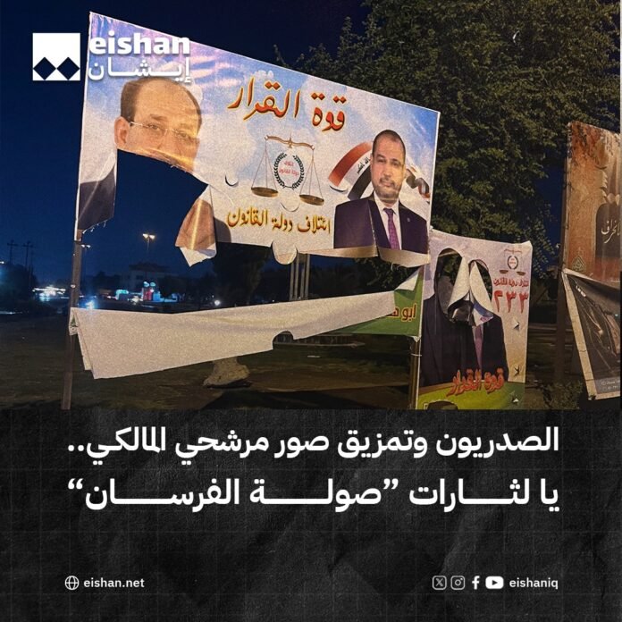 وتداولت منصات التواصل الاجتماعي، مقاطع فيديوية تظهر احتراق لافتة انتخابية لزعيم ائتلاف دولة القانون، نوري المالكي، بعد ساعات من وضعها في ساحة مظفر مدخل مدينة الصدر.
