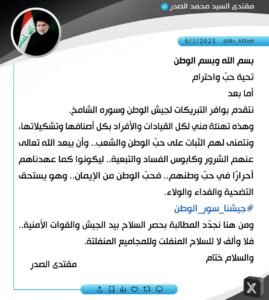 وهنأ الصدر، في تدوينة له على منصة إكس، جميع قيادات وأفراد الجيش العراقي بكل أصنافهم وتشكيلاتهم، بذكرى تأسيسه المئة، متمنياً لهم “الثبات على حب الوطن والشعب”.
