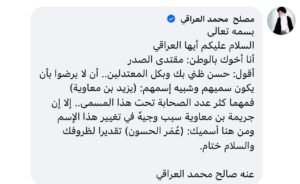 رد زعيم التيار الصدري، السيد مقتدى الصدر، اليوم الأربعاء على منشور يزيد الحسون الخاص بكملة الصدر ليلة أمس وما يتعلق بتسمية “يزيد”.