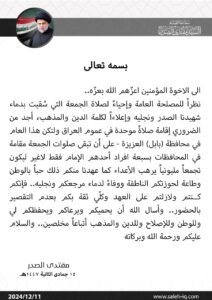 دعا زعيم التيار الوطني الشيعي، السيد مقتدى الصدر، أنصاره إلى إقامة صلاة جمعة موحدة مليونية في محافظة بابل، قائلاً: “ليكون تجمعاً يرهب الاعداء كما عهدنا منكم ذلك، حباً بالوطن، وطاعة لحوزتكم الناطقة، ووفاءً لدماء مرجعكم ونجليه”.