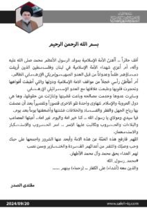 نشر زعيم التيار الوطني الشيعي، تغريدة قال فيها، إنه “حائر” هل يهنئ الأمة الإسلامية بمولد الرسول الأعظم، أم يعزيها بشهدائها في لبنان وفلسطين، فيما أشار إلى أن دول العروبة والإسلام تتهاوى واحدة تلو الأخرى.