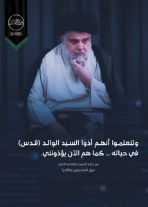 ونشر وزير القائد، منشوراً على منصاته، تابعتها “إيشان”، تضمن كلاماً مقتبساً من السيد الصدر جاء نصه: “ولتعلموا أنهم آذوا السيد الوالد في حياته .. كما هم الآن يؤذونني”.