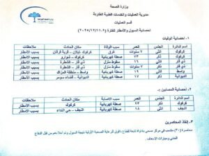 كما أشارت وزارة الصحة إلى تسجيل حالتي إصابة بالصعق الكهربائي في محافظتي كركوك والنجف، جرى نقلهما لتلقي العلاج اللازم.