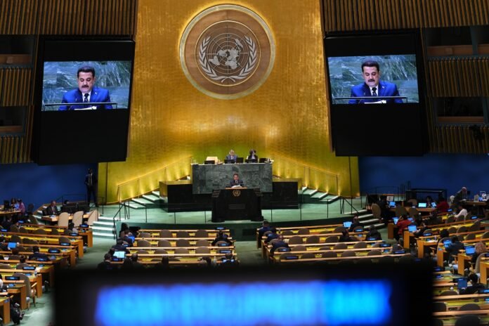 وقال السوداني في كلمة امام الجمعية العامة للأمم المتحدة بدورتها التاسعة والسبعين في نيويورك، والتي تنعقد تحت عنوان (عدم ترك أحد خلف الركب: العمل معاً من أجل السلام والتنمية المستدامة والكرامة الإنسانية للأجيال الحالية والمقبلة)، ان ” الدورةُ التاسعةُ والسبعونَ لاجتماعاتِ الجمعيةِ العامةِ للأممِ المتحدةِ تأتي في خضمِّ ظروفٍ خطيرةٍ تمرُّ على الشرقِ الأوسط، يواجهُ فيها النظامُ الدوليُّ العالميُّ امتحاناً صعباً يهددُ وجودَه، ويجعلَهُ عاجزاً عن تحقيقِ الأهدافِ التي تأسسَ من أجلها، ومنها الحفاظُ على الأمنِ والاستقرارِ الدوليَينِ وحقوقِ الانسان”، مبينا: ” إذ نشهدُ اليومَ سوابقَ تُخرَقُ فيها المواثيقُ والأعرافُ الدوليةُ كافة، ويتمُّ تحييدُ المُؤسساتِ الدوليةِ المُفترضِ بها أن تساهمَ في إدارةِ العلاقاتِ الدوليةِ وتنظيمِها، بما يعززُ السلمَ والاستقرار، ويرتقي بالعلاقاتِ الإنسانيةِ بعيداً عن العُنفِ والتعاملِ الوحشي”.