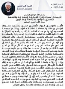 وبمناسبة الزيارة الأربعينية، أشاد الكعبي بالجهود الاستثنائية للأمانة العامة للعتبتين الحسينية والعباسية ومواكب السخاء والإباء ومحافظة كربلاء وكل القوات الأمنية البطلة التي شاركت في تأمين الزيارة وخدمة زوار الإمام الحسين عليه السلام وأخيه أبي الفضل العباس عليه السلام”.