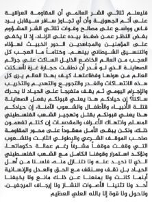 وأكمل الكعبي بيانه قائلاً: “كما إننا نسمع من هنا وهناك عن استهداف غادر قد يطال العراق، فليعلم ثلاثي الشر العالمي أن المقاومة العراقية على أتم الجهوزية وأن أي تجاوز سافر سيقابل برد قاس وواسع على مصالح وقوات ثلاثي الشر المشؤوم بغض النظر عمن ضغط بيده على الزناد، إذ لا يخفى على المؤمنين والمجاهدين الدور الخبيث لهؤلاء والتنسيق الشيطاني بينهم”.