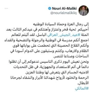 وقال المالكي في تدوينة عبر موقع “إكس” تابعتها “إيشان”: “إلى رجال العزة وحماة السيادة الوطنية أحييكم تحية فخر واعتزاز وأهنئكم في عيدكم الثالث بعد المئة”.