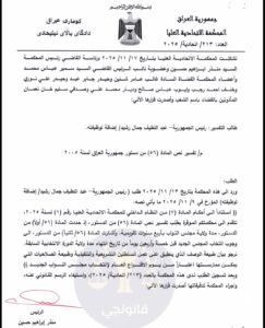 أصدرت المحكمة الاتحادية العليا، اليوم الاثنين (17 تشرين الثاني 2025)، قراراً تفسيرياً مهماً يتعلق بمواعيد انتهاء ولاية السلطتين التشريعية والتنفيذية، بناءً على طلب من رئيس الجمهورية عبد اللطيف جمال رشيد.