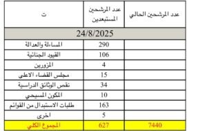وذكرت المفوضية في بيان، أن عدد المرشحين المستبعدين لغاية اليوم الأحد 24/8/2025 بلغ 627 مرشحاً لأسباب مختلفة، كما مبين في الجدول أدناه:
