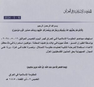 أعلنت المقاومة الإسلامية في العراق، اليوم الخميس، قصف هدف حيوي في مستوطنة إيلات الإسرائيلية بالطيران المسير.