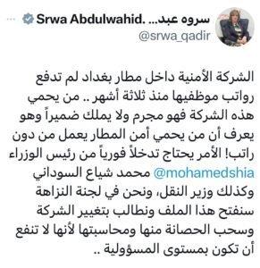 ورأت عبد الواحد، عبر تدوينة على منصة “اكس”: إن “من يحمي الشركة مجرم لا يملك ضميرا”، لافتة إلى أن “الأمر يتطلب تدخلا فوريا من قبل رئيس الوزراء”.