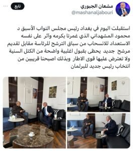 وقال الجبوري في تدوينة عبر “إكس” تابعتها منصة “إيشان”، إنه “استقبل اليوم في بغداد رئيس مجلس النواب الأسبق محمود المشهداني”.
