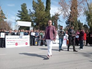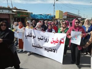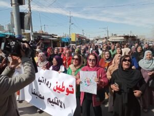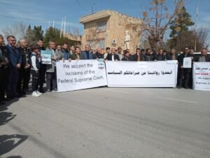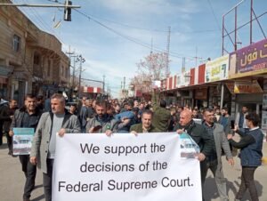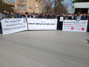 ورفع المتظاهرون لافتات تدعو لتوطين رواتبهم، وتساند قرارات المحكمة الاتحادية، ووصفوا ما حصل مع قضية رواتبهم في الإقليم بجملة “حامينا حرامينا” التي زينت لافتاتهم.