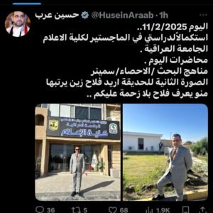 وكتب عرب في تغريدته: “استكمالاً لدراستي في الماجستير لكلية الإعلام – الجامعة العراقية.. محاضرات اليوم: مناهج البحث / الإحصاء / سمينر”.