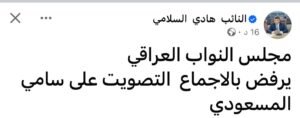 وكتب النائب هادي السلامي منشوراً تابعته “إيشان”: “مجلس النواب يرفض بالإجماع التصويت على سامي المسعودي”.