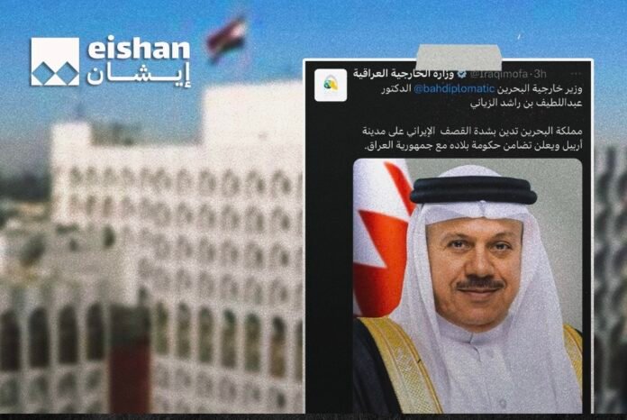 ونشر الحساب، 11 تدوينة تتعلق بالقصف الإيراني على أربيل منذ ليلة الثلاثاء، من بينها تدوينتان واحدة لوزير الخارجية البحريني عبر فيها عن إدانته لاستهداف كردستان، والأخرى لأمين الجامعة العربية.