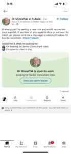 وأضاف: “نبذة عني وما أبحث عنه: أبحث عن وظائف مستشار أول (Senior Consultant). وأنا منفتح على الفرص المتاحة في العراق”.