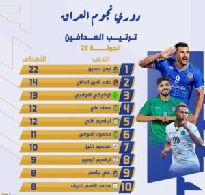 أعلنت اللجنة الفنية لدوري نجوم العراق، عن هداف المسابقة بعد انتهاء الجولة الخامسة والعشرين من دوري نجوم العراق لكرة القدم للمحترفين .