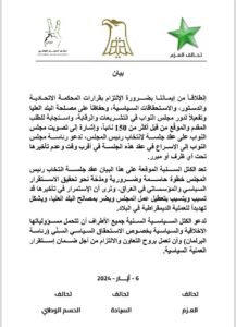 أصدرت تحالفات “العزم والسيادة والحسم”، اليوم الإثنين، بياناً مشتركاً دعوا من خلاله إلى الإسراع بعقد جلسة انتخاب رئيس البرلمان، وعدم تأخيرها تحت أي ظرف أو مبرر.