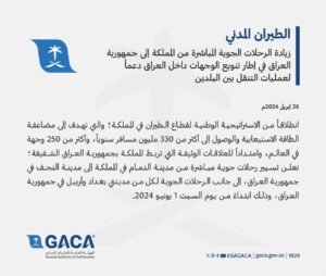 وقالت الهيئة في بيان حصلت عليه منصة “مرفأ”، إنها “تسعى إلى زيادة الرحلات الجوية المباشرة من المملكة إلى جمهورية العراق في إطار تنويع الوجهات داخل العراق دعماً العمليات التنقل بين البلدين”.