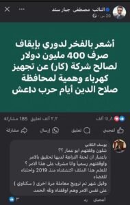 على منصة الفيس بوك، تباهى النائب، مصطفى سند، بإيقاف صرف 400 مليون دولار لصالح شركة “كار” عن تجهيز كهرباء وهمية لصلاح الدين، قبل أن “يستغرب” النائب يوسف الكلابي، ويقول إنه “اكتشف الملف منذ 2019، وقبل أيام أوقف قضية مشابهة”.