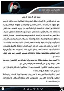 تحدّث عن موته.. الصدر يوجّه خطاباً مطوّلاً لأنصاره: استمروا على الإصلاح ومحاربة الفاسدين