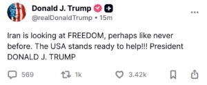 وقال ترامب في تدوينة تابعتها منصة “إيشان”: “إيران تتطلع إلى الحرية، ربما كما لم يحدث من قبل. الولايات المتحدة تقف على أهبة الاستعداد للمساعدة!!!”.