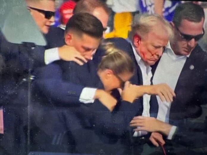 وظهرت في اللقطات المصورة دماء على أذنه ثم شوهد ضباط من جهاز إنفاذ القانون على سطح قريب من المنصة التي كان يقف عليها ترامب.