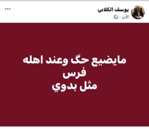 تدوينة الكلابي على فيسبوك تضمنت “ما يضيع حك وعند أهله فرس”، وذيلها بعبارة “مثل بدوي”. على غرار تدوينة الكريم.