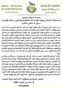 وقالت الحركة في بيان ورد لمنصة “إيشان”، إن “ما حصل في سوريا لم يكن عفوياً، وهذا في ظل انشغال المحور بإسناد غزة، حيث وظفت له غرفة عمليات في تركيا لإدارة الخراب بتدبير بريطاني ومشاركة مخابراتية من الناتو والكيان الصهيوني، عبر تقديم الدعم والتخطيط، من تسخير للأقمار الصناعية والمسيرات التي ترصد تحركات واماكن وجود القوات السورية”.