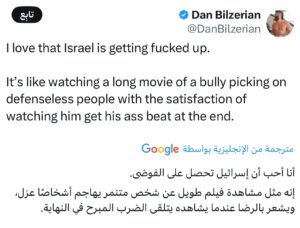 وكتب بلزيريان، عبر حسابه في منصة “اكس”: “أحب أن إسرائيل تتعرض للفوضى، إنه مثل أنك تشاهد فلماً طويلاً عن شخص متنمر يهاجم أشخاصاً عزل، وتشعر بالرضا عندما تشاهده يتلقى الضرب المبرح في النهاية”.