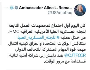 وذكرت رومانوسكي في تدوينة عبر موقع “إكس”، تابعتها “ايشان”: “كان اليوم أول اجتماع لمجموعات العمل التابعة للجنة العسكرية العليا الأمريكية العراقية HMC من خلال عملية اللجنة العسكرية العليا”.