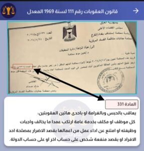 وقال سند، عبر منشور على حسابه في منصة “فيسبوك”، إن “المادة ألتي تم تكييف (نور زهير) عليها هي المادة (444 _حادي عشر) من قانون العقوبات، وليست المادة (331) من ذات القانون”.