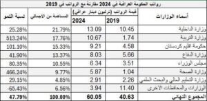 وتابع: “تلتها وزارة التربية بنسبة 18% من مجموع الرواتب، إذ ارتفعت مخصصاتها من 1.74 تريليون دينار في 2019 إلى 10.7 تريليون دينار في 2024، أي بزيادة مذهلة بلغت 513%، وهي الأعلى بين جميع الوزارات”.