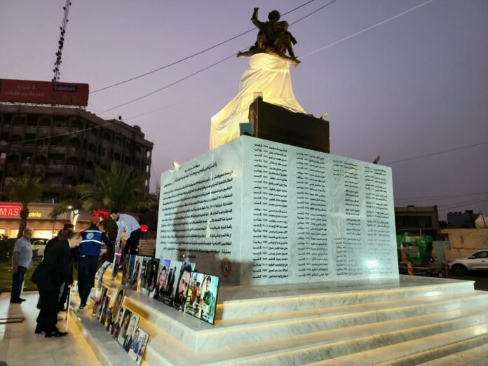 وأعلنت مؤسسة الشهداء، أن النصب الجديد يتوسط ساحة الحرية في منطقة الكرادة، ليحاكي حادثة تفجير مجمع الليث التجاري في منطقة الكرادة، في الثالث من تموز 2016.