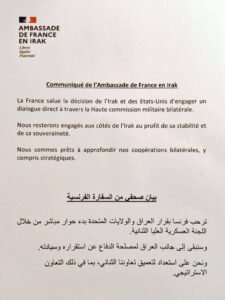 وذكر بيان صادر عن السفارة: “ترحب فرنسا بقرار العراق والولايات المتحدة بدء حوار مباشر من خلال اللجنة العسكرية العليا الثنائية. وسنبقى إلى جانب العراق لمصلحة الدفاع عن استقراره وسيادته”.