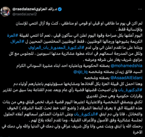 وقال العزاوي في نص تدوينته: “لم أكن في يوم من الأيام طائفياً أو قبلياً أو قومياً أو مناطقياً، كنت ولا أزال أنتمي للإنسانية فقط. اليوم أعلنها بصراحة أنني سأكون قبلياً، نعم أنتمي لقبيلة العزة الكريمة بشيوخها ورجالها الوطنيين، الوطنيين المخلصين المحبين للعراق.”